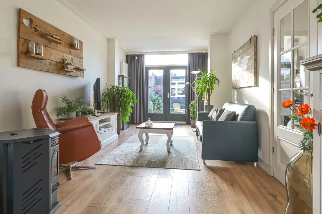 Bij binnenkomst valt meteen de fijne sfeer op. De woonkamer is aan de achterzijde uitgebouwd, wat zorgt voor extra leefruimte en een prettige lichtinval. Aan de voorzijde geniet je vanuit de erker van een vrij uitzicht op de groene straat, terwijl je aan de achterzijde profiteert van de uitbouw en de verbinding met de tuin door middel van de openslaande deuren.