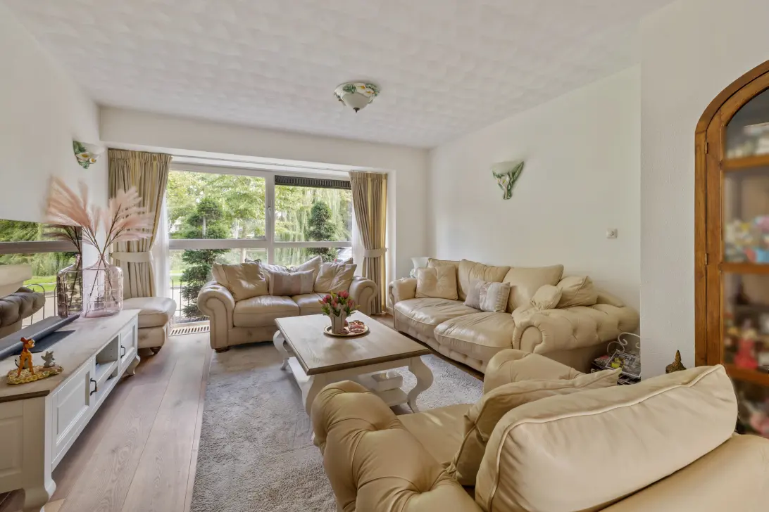 Begane grond: entree, hal voorzien van toilet met fontein, trap naar eerste verdieping en entree naar de aangebouwde garage voorzien van wastafel en entree naar de zijtuin, royale living voorzien van half open keuken voorzien van alle benodigde apparatuur, grote ramen waardoor veel lichtinval en hoog plafond, schouw met open haard en entree naar de zonnige en prachtig aangelegde tuin gesitueerd op het zonnige zuidwesten.