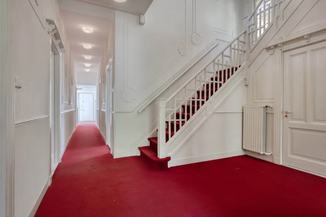 Het magistrale trappenhuis met balustrade op de verdieping is rijk gedecoreerd met ook hier glas-in-lood vensters en sierlijk stucwerk op wanden en plafonds. Op de verdieping bevinden zich vijf (slaap-)kamers, verschillend in afmeting, waarvan twee met balkon. Op de volwaardige tweede verdieping zijn momenteel twee (slaap-)kamers en een grote open ruimte die eenvoudig is te verdelen in twee of drie kamers.