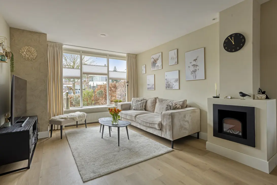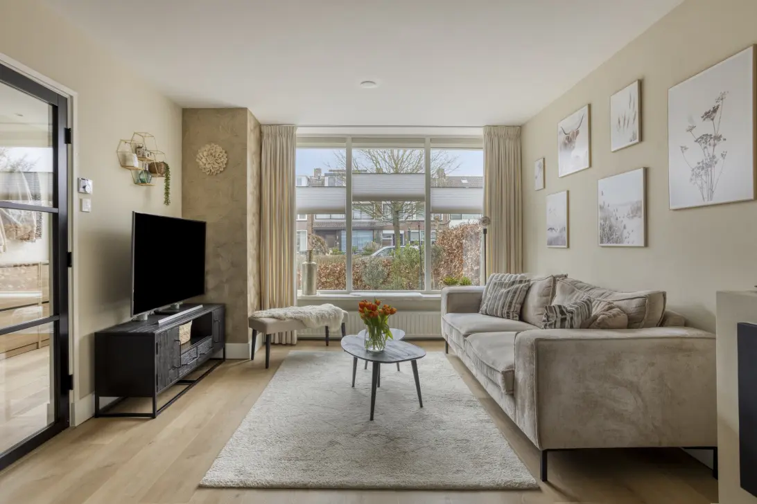 De woonkamer is opvallend licht door de grote raampartijen en biedt een vrij uitzicht aan zowel de voor- als achterzijde, wat zorgt voor een aangenaam gevoel van rust en privacy. De uitbouw aan de achterzijde vormt een volwaardig verlengstuk van de leefruimte en kan op stijlvolle wijze worden afgesloten met houten schuifdeuren. De openslaande deuren naar de achtertuin maken het eenvoudig om binnen en buiten met elkaar te verbinden, waardoor je op zonnige dagen optimaal geniet van het buitenleven. De achtertuin beschikt over een praktische stenen berging, achterom en vormt een fijne plek om te ontspannen.