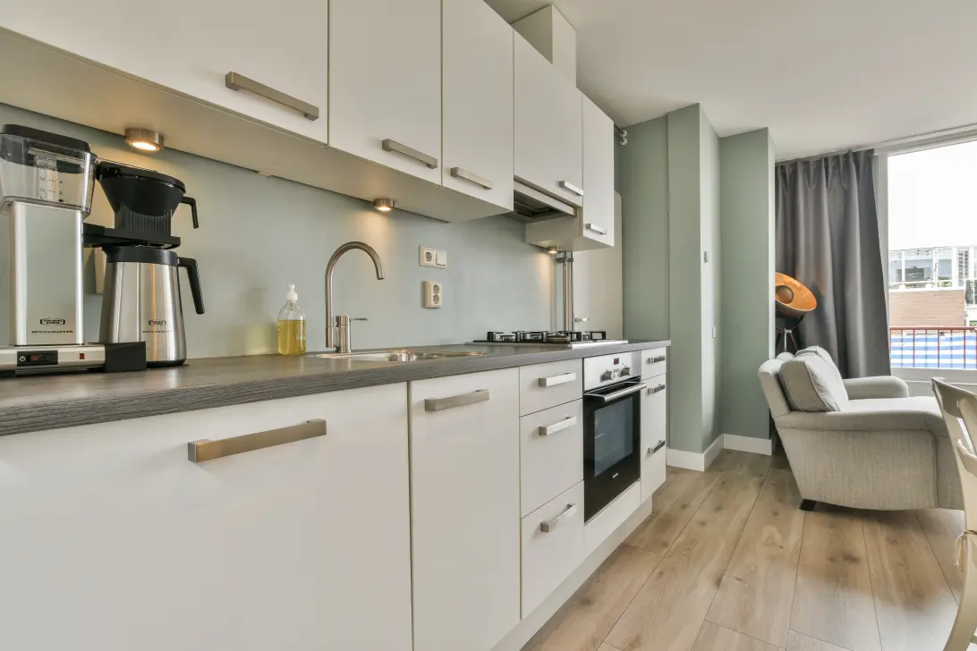 Via de centrale entree op de begane grond bereik je de woning op de vierde verdieping. De hal biedt ruimte voor een garderobe en geeft toegang tot de lichte woonkamer met luxe open keuken. Deze is volledig uitgerust met o.a. een koel-vriescombinatie, vaatwasser, Siemens grill/oven, gaskookplaat en afzuigkap.
