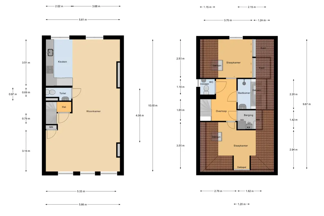 De slaapkamers hebben zowel een raam een de gevelzijde als een dakraam. Er is een diepe bergkast met wasmachineaansluiting en stookruimte. Voor de exacte indeling verwijzen wij u naar de plattegronden.