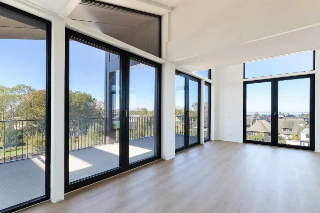 De woonkamer is een royale, lichte ruimte dankzij de grote raampartijen die voor een overvloed aan natuurlijk licht zorgen. Deze leefruimte grenst direct aan de open keuken, die is voorzien van hoogwaardige inbouwapparatuur. De keuken biedt niet alleen een praktische opstelling, maar nodigt ook uit tot gezellige etentjes en culinaire creativiteit.