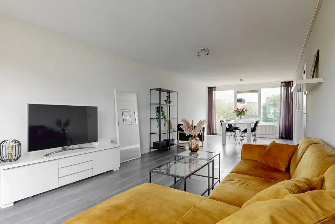 De royale woonkamer is strak afgewerkt en profiteert van veel daglicht dankzij grote raampartijen en een gunstige ligging. De woonkamer is voorzien van ramen aan beiden kanten. Voorheen was hier een derde slaapkamer, deze is makkelijk te realiseren. Twee openslaande deuren leiden naar het zonnige terras op het westen – perfect voor een drankje in de middag- en avondzon.