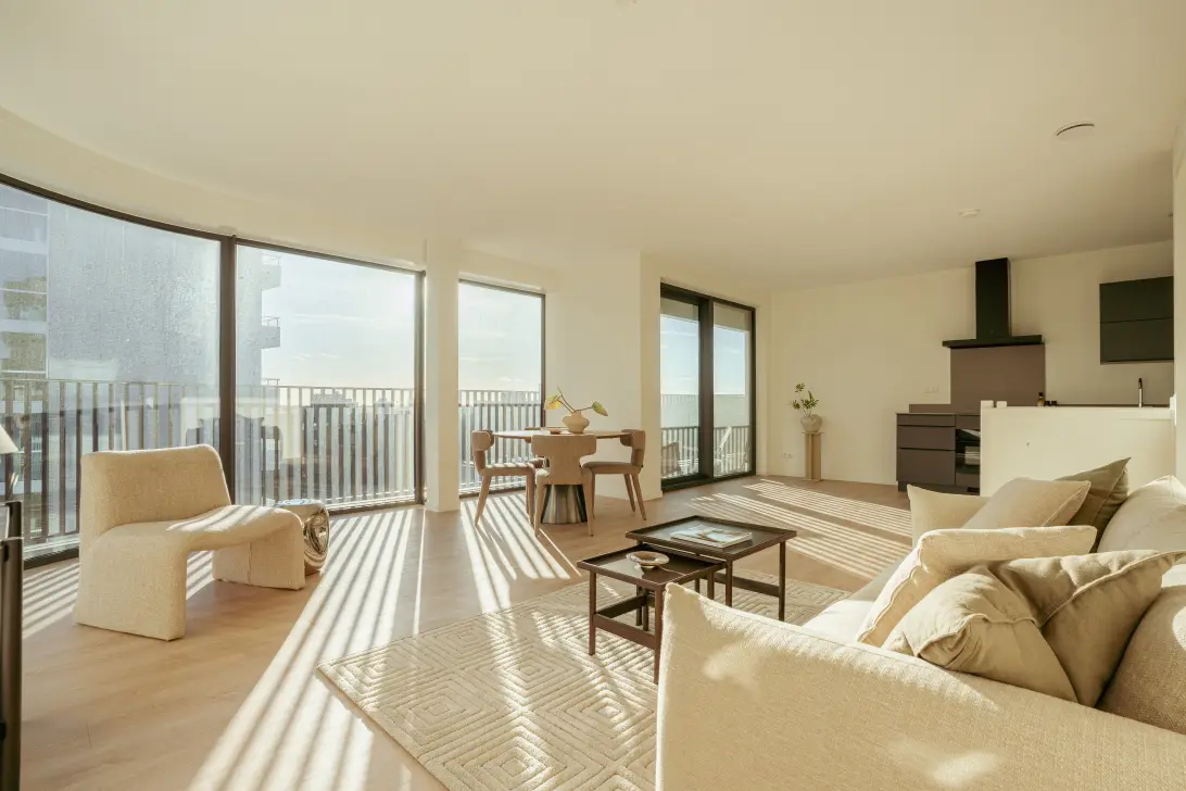 Dankzij de gebogen raampartij, enorme woonkamer én het grote balkon dat rond het appartement loopt, kunnen we rustig stellen dat dit een van de pareltjes van Berghaus is. Een appartement gemaakt voor levensgenieters die kiezen voor een luxe leven in Amsterdam.