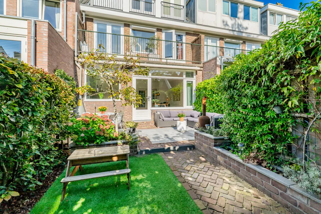 The back garden is a green oasis and faces perfectly south, so you have a front row seat on sunny days. Prefer some shade? The awning is easy to lower! The garden, landscaped in 2020, has rear access, a detached stone shed with electricity, and a covered bicycle shed.