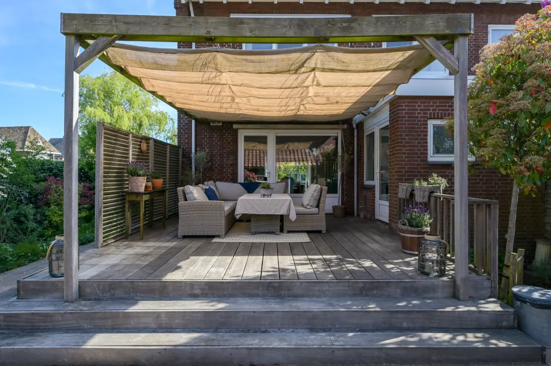 Loop door de verrassend brede met veel groen afgewerkte zijtuin. Aan de op het zuidwesten georiënteerde achterzijde is een royaal tegelterras te vinden die voor de stenen schuur en garage ligt. Tegen de achterzijde van de woning is een sfeervolle verhoogde houten vlonder geplaatst, die zowel vanuit de keuken als vanuit de eetkamer bereikt kan worden. Boven deze vlonder hangt een schaduwdoek dat voor schaduw en sfeer zorgt op een zonnige dag. Dit zou wel eens jouw favoriete plek in de tuin kunnen worden.