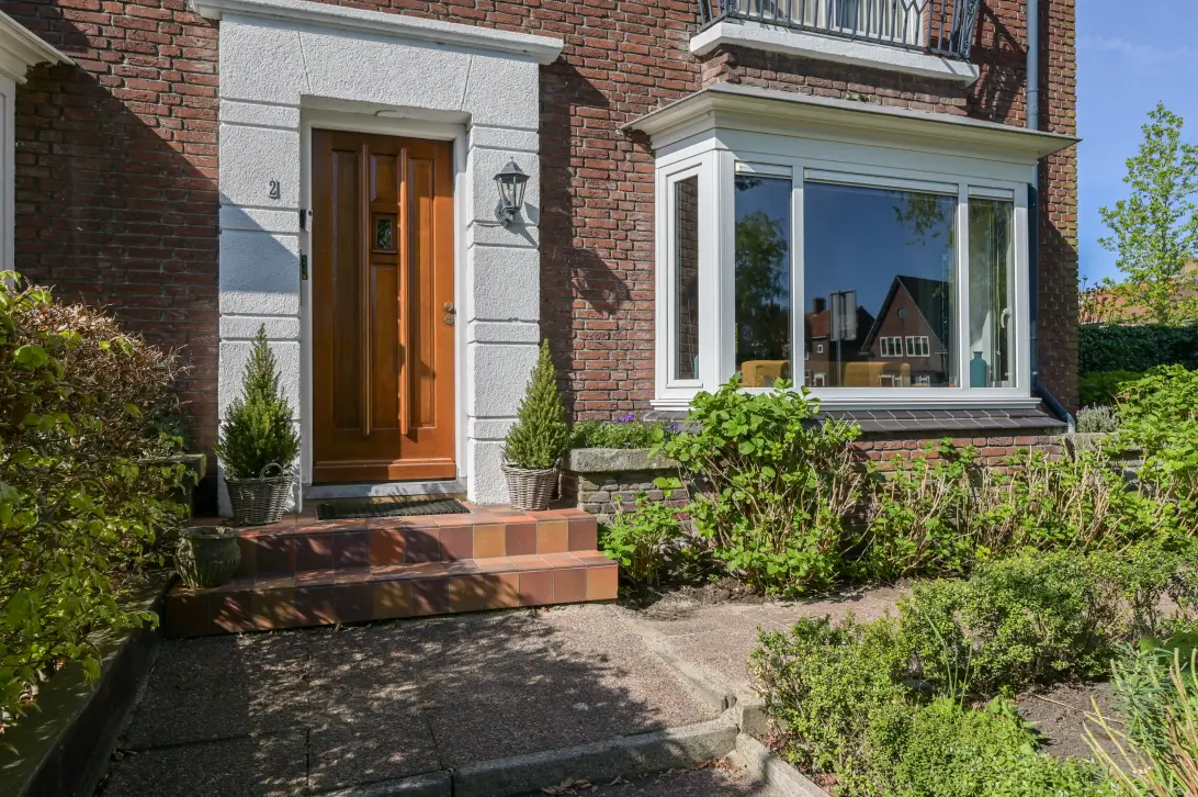 In de voortuin zijn tegels gecombineerd met groene plantvakken met vaste planten, struiken en bomen. De klassieke erker geeft de woning een sfeervol aanzicht.