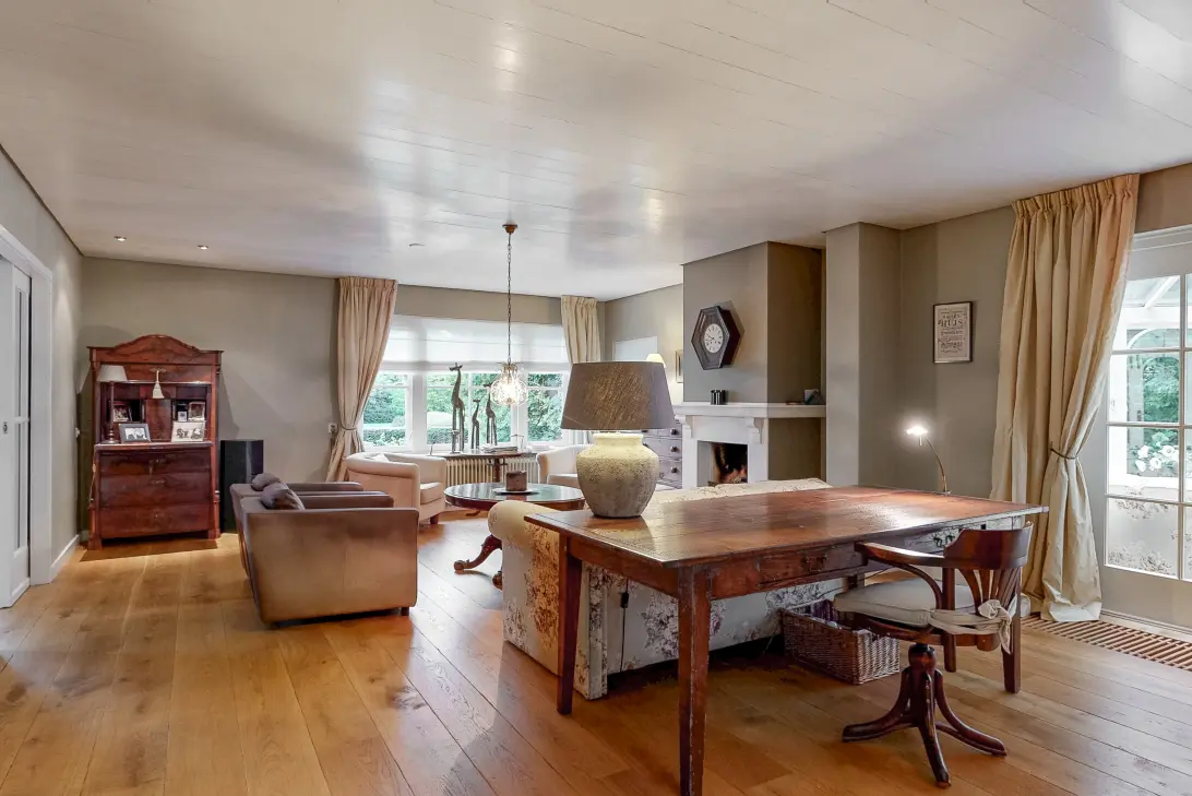 Indeling: royale hal met trapopgang en toiletruimte, werk-/slaapkamer, royale woonkamer en-suite met gas open haard, zitkamer met schouw, eiken plankenvloer en fraaie Engelse serre met brede openslaande deuren, gesloten eetkeuken met toegang tot de tuin en uitgebreide luxe keukenunit voorzien van een composiet aanrechtblad en inbouw combimagnetron, Quooker, elektrische oven, vaatwasser, inductiekookplaat met afzuiging, koelkast/vriezer, kickspace en dubbele wasbak, ruime bijkeuken met cv-opstelling, 1e badkamer met ligbad, wandcloset, dubbele wastafel in meubel, douchecabine en designradiator.