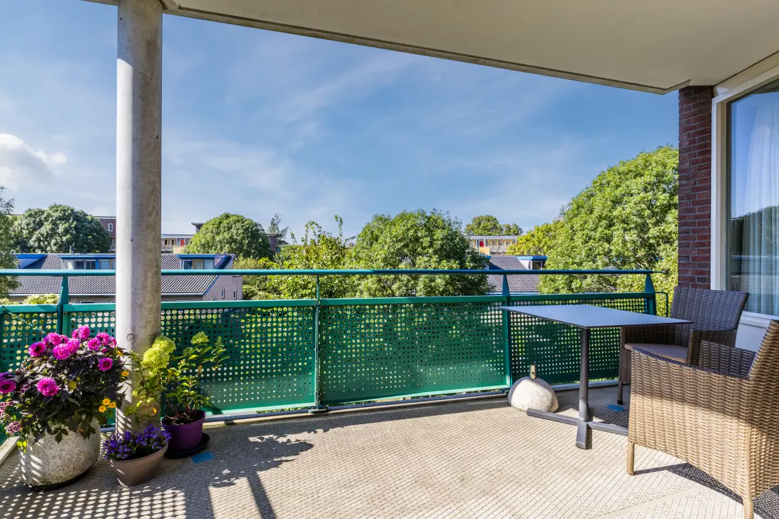 De woonkamer heeft een prachtige lichtinval door de vele ramen en loopt door in de half open keuken. Via de schuifpui betreed je het prachtige balkon van 10m2 om heerlijk te genieten van de groene buurt en de zon en is een verlenging van de woonkamer.