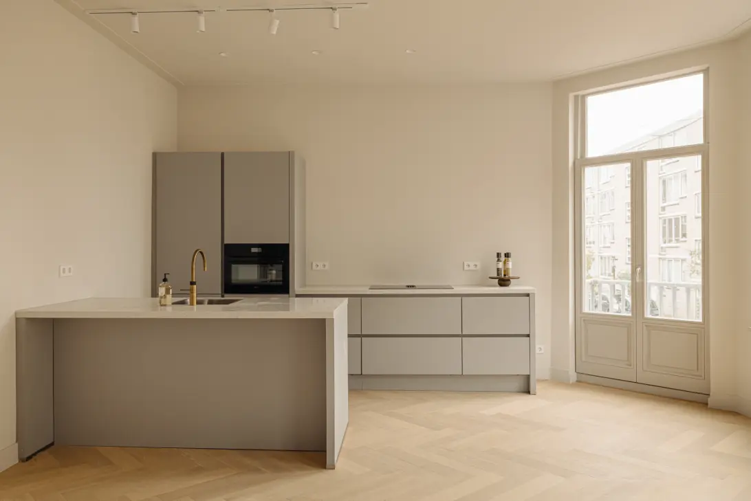 Aan de voorzijde bevindt zich de royale, lichte woonkamer met luxe open keuken. Het kookeiland en de grote raampartijen benadrukken de ruimtelijkheid en de hoekligging. Het Franse balkon maakt deze ruimte helemaal compleet.
