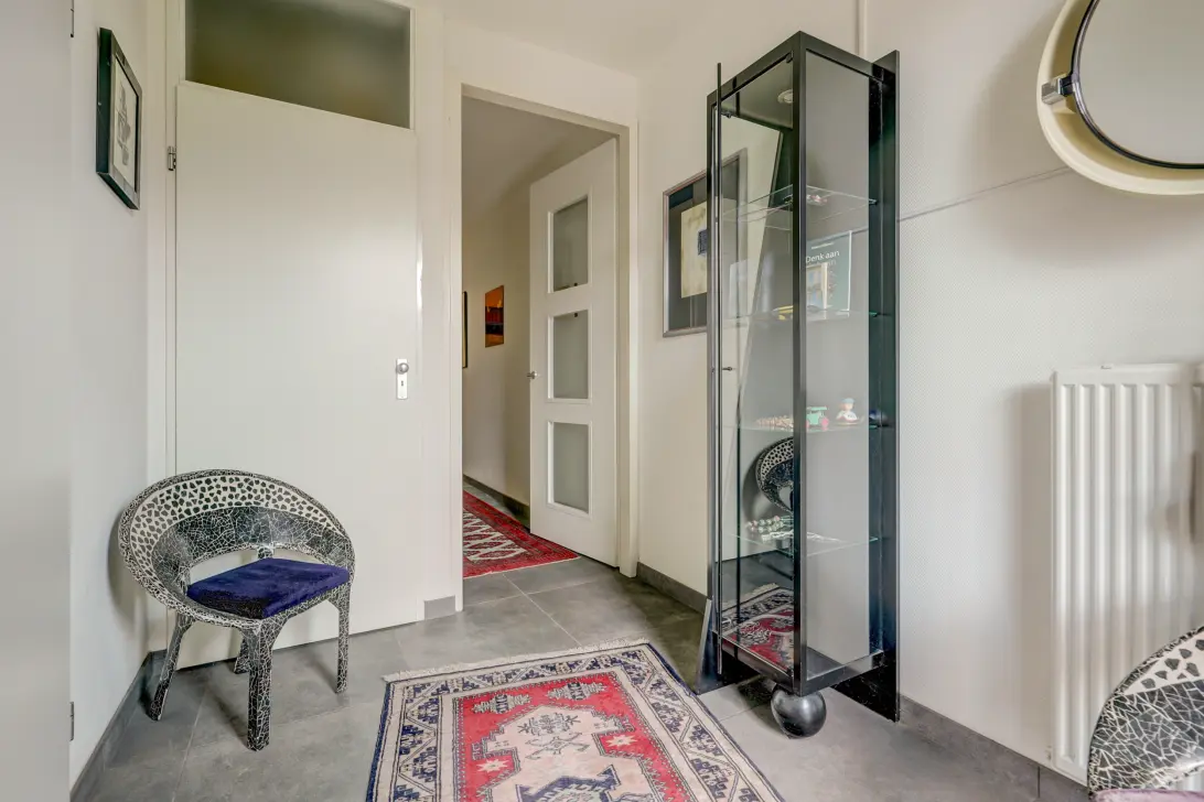 Bij binnenkomst zie je een mooie, ruime hal, waar we een wachtkamer van hebben gemaakt voor cliënten. Links is dan de ruime garage en rechtdoor is de rest van de hal. Meteen de eerste deur links is het toilet, nieuw geplaatst in 2014. Verplicht omdat ik beneden de praktijkruimte heb. De tweede deur links is de verwarmingsketel, hiervan hebben we een garderobe gemaakt. Wanneer je rechtdoor loopt kom je in de praktijkruimte, een fijne grote kamer waar je van alles mee kan. Omdat er geen raam in deze kamer aanwezig is hebben we een ventilatiesysteem laten maken.