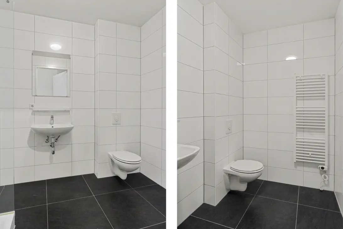 De badkamer is uitgevoerd in dezelfde stijl als de andere woningen in het complex: grijze vloertegels, witte wandtegels tot het plafond, een douche met glazen wand en gordijn, een wandcloset, wastafel met spiegel en planchette en een aansluiting voor de wasmachine.