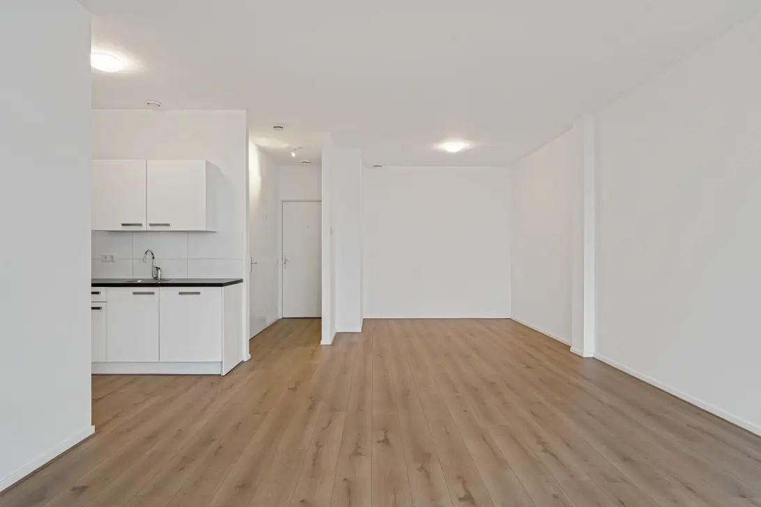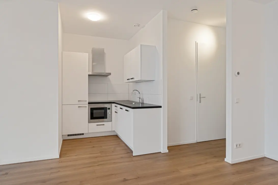 De woonkamer is licht en functioneel ingericht, met een open keuken in hoekopstelling. Deze is voorzien van een grijs werkblad, witte kastfronten, twee bovenkastjes, een afzuigkap, koel/vriescombinatie (met 2,5 laden), magnetron en een vaatwasser direct naast de spoelbak.