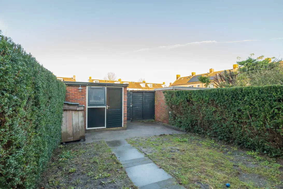 De achtertuin ligt op het noordwesten. Door de lengte van de tuin is er ruimte voor meerdere zitplekken. Achterin bevindt zich een berging en de tuin beschikt daarnaast over een achterom, wat handig is voor fietsen of tuinbenodigdheden.