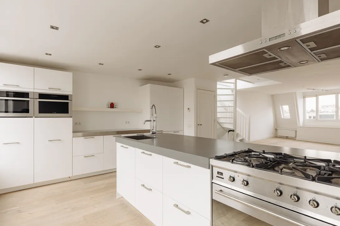 Op de top verdieping bevindt zich de woonverdieping. Aan de voorzijde ligt de woonkamer met grote ramen die het daglicht ruim binnenhalen en een mooi uitzicht over de Ferdinand Bolstraat geven. De sfeer is warm en ruimtelijk, ideaal voor lange avonden met vrienden of ontspannen momenten voor jezelf. Aan de achterzijde ligt de keuken met een ruim schiereiland en drie grote ramen die uitkijken over de binnentuinen. Dit maakt de ruimte licht en prettig om in te koken, te werken of aan de bar te zitten, terwijl iemand aan het koken is.