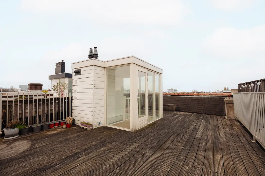 Vanuit deze verdieping is middels de vaste trap het dakterras te bereiken, dat absoluut een van de hoogtepunten van het huis is, vrij uitzicht, zon van ochtend tot avond en genoeg ruimte om te loungen, te eten of gewoon even in stilte te genieten van het uitzicht over Amsterdam.