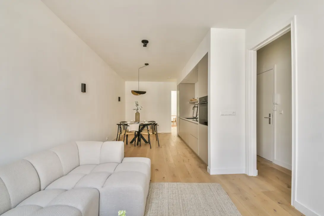 At the front of the apartment, you'll find the bright and inviting living room with an open kitchen, equipped with various built-in appliances: an induction cooktop with extractor hood, a combi microwave/oven, a fridge-freezer, dishwasher, and a built-in washing machine. Both the kitchen and the living room provide access to the west-facing balcony at the front.