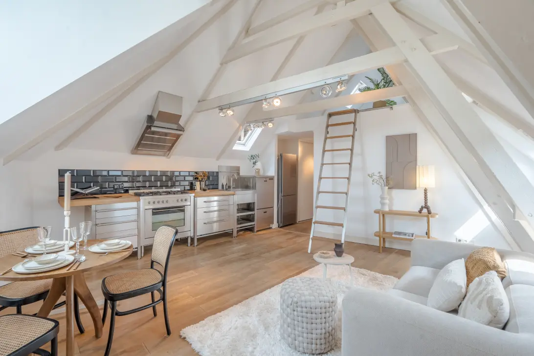 At the end of the hallway is the cozy living room with open kitchen. The kitchen is modern and equipped with various built-in appliances, including a dishwasher, fridge-freezer, oven, and 5-burner stove. The living room has a cozy atmosphere thanks to the original wooden support structure, which has been left exposed. A separate staircase leads to the creative space, which runs almost the entire length of the apartment and offers many possibilities: extra storage space, a lounge area, or a workspace.