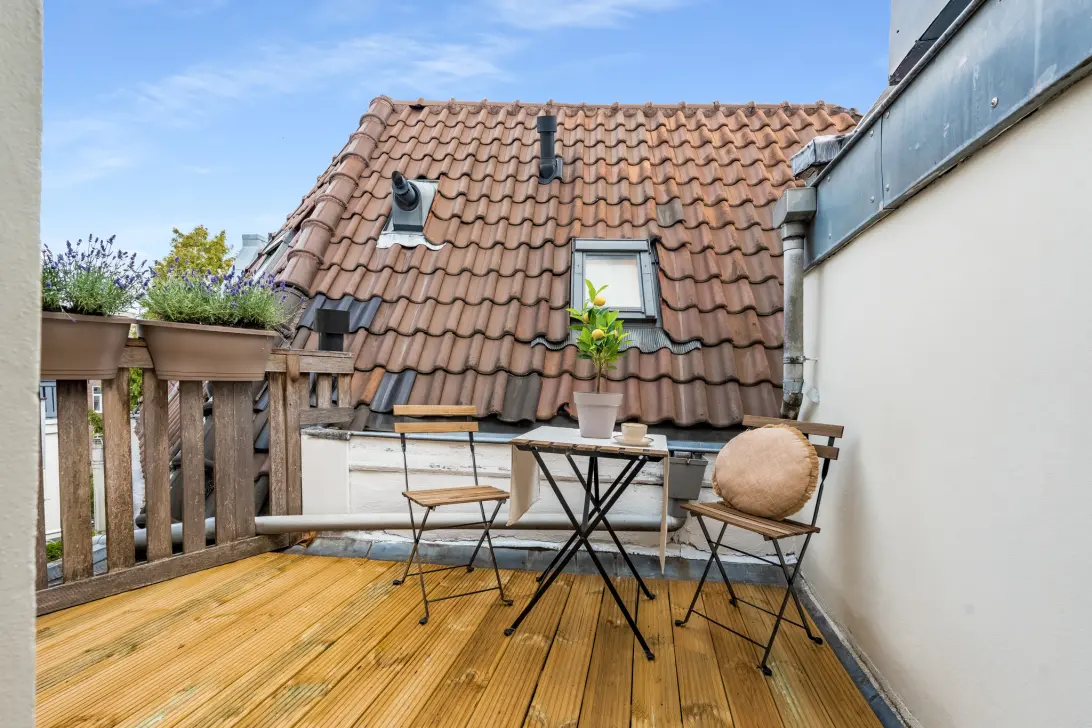The communal staircase leads to the entrance of the apartment. The bright hall provides direct access to the cozy roof terrace. Here you will also find the two spacious bedrooms with skylights and beautiful exposed wooden beams. Uniquely, both bedrooms are of equal size. The bathroom is surprisingly spacious and equipped with a walk-in shower, toilet, and modern sink unit. Here too, original details combined with modern finishes give the space a distinctive atmosphere.