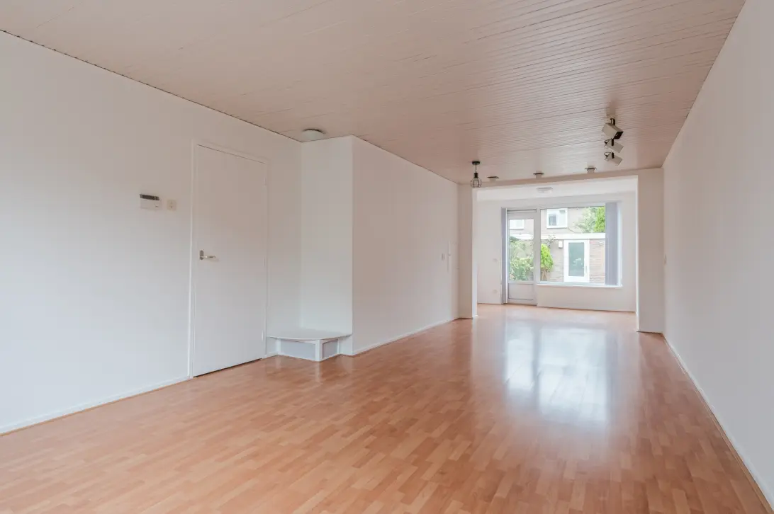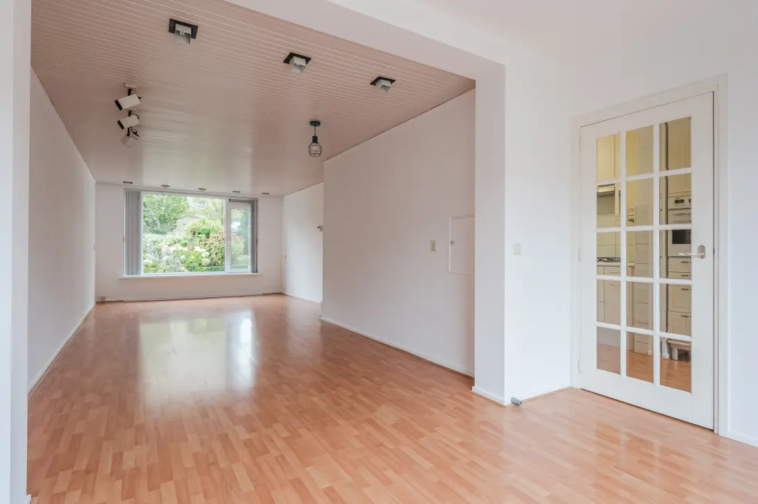 De woonkamer is uitgebouwd en daardoor heerlijk ruim. Er ligt een nette vloer en de wanden zijn voorzien van strak stucwerk. Dankzij de brede raampartij aan zowel de voor- als achterzijde geniet de woonkamer van een geweldige lichtinval.