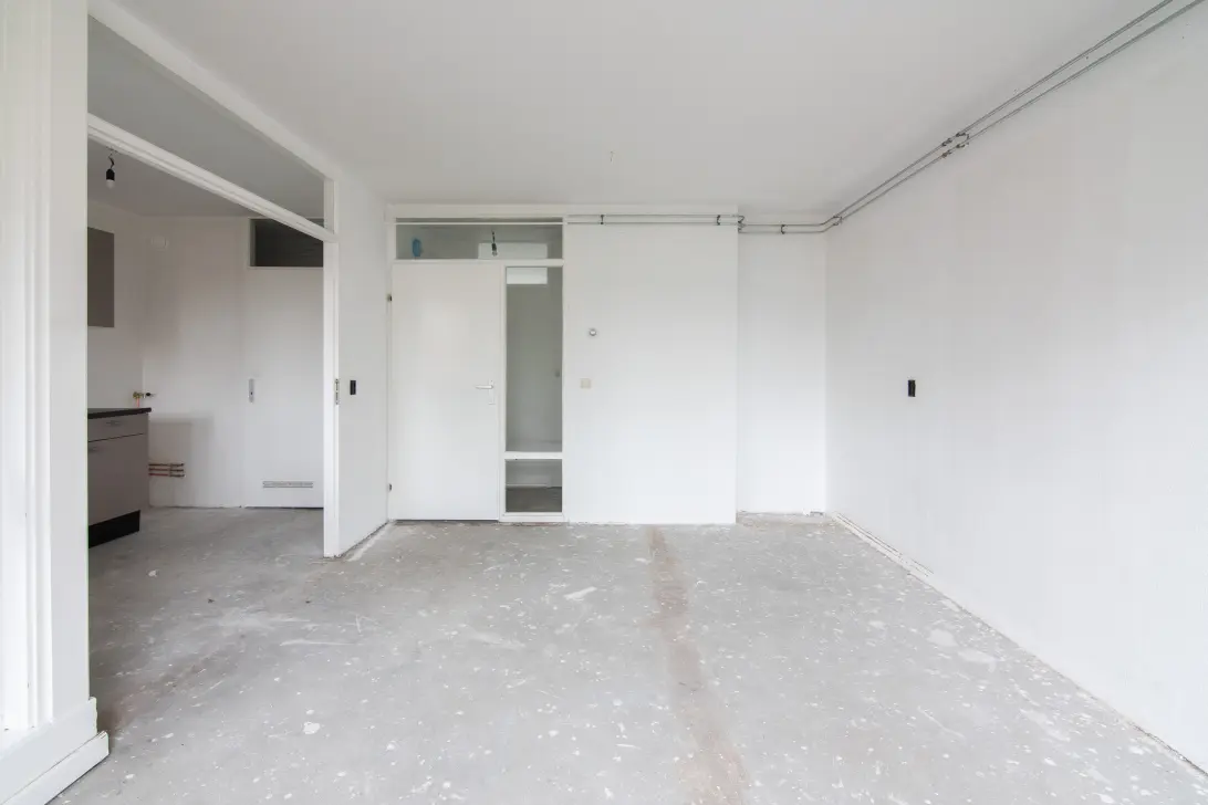 Aan de achterzijde ligt de ruime woonkamer. Vanuit deze kamer heeft u toegang tot het balkon, gelegen op het westen. De woonkamer staat in halfopen verbinding met de keuken, wat zorgt voor een ruimtelijk en betrokken gevoel. Vanuit de keuken bereikt u een praktische bergkast met daarin de opstelling voor de cv-ketel.