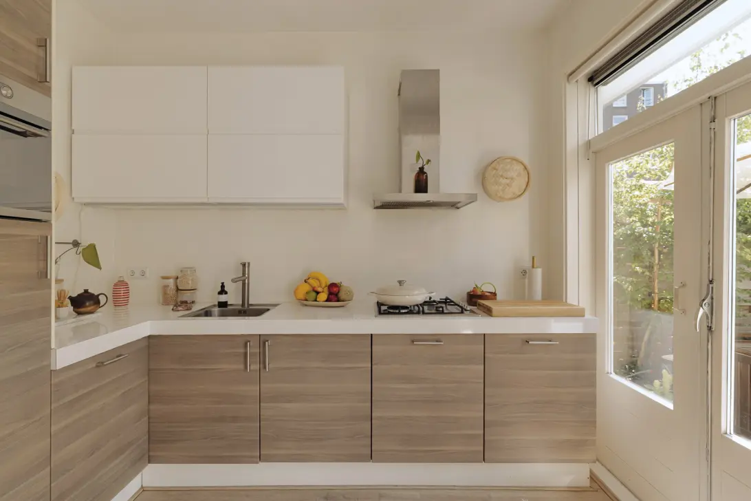 - All of this is beautifully finished with a sleek countertop and warm wood-look cabinets, making cooking a true pleasure;
