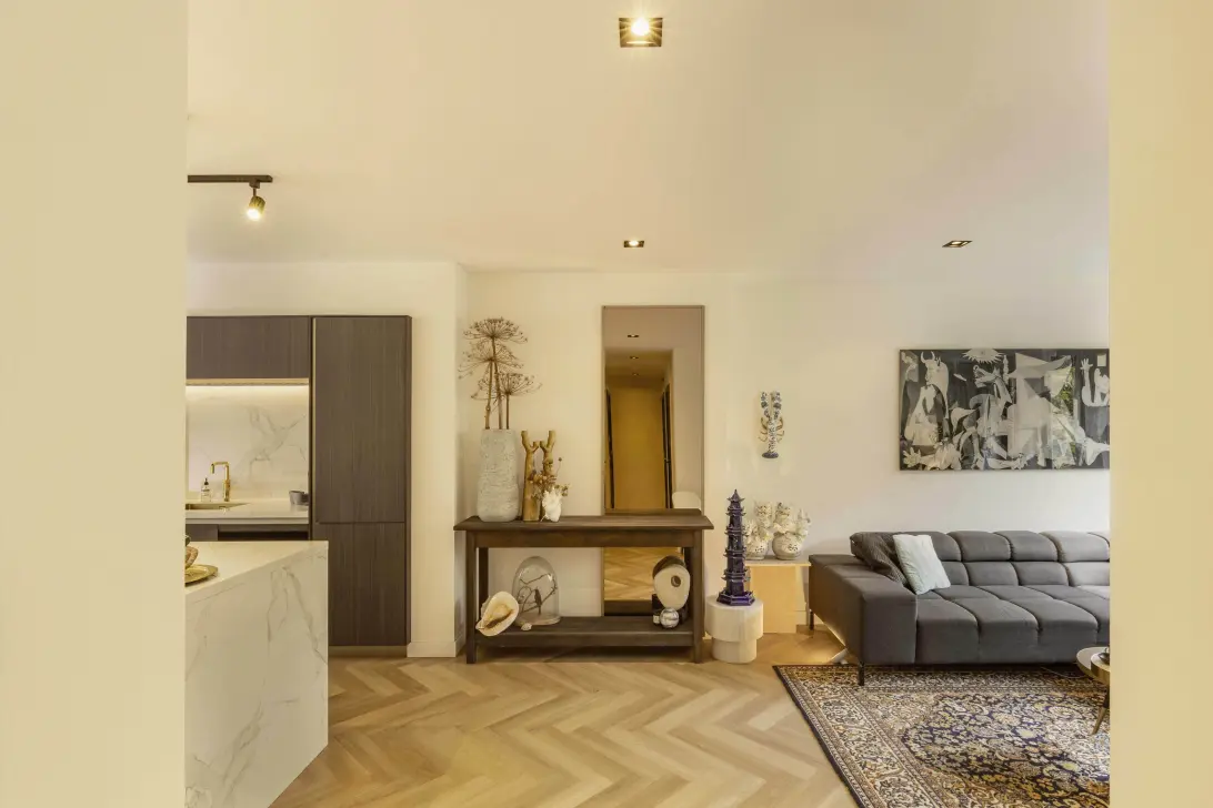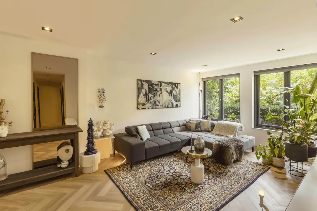 Private entrance at ground level. The hallway, with ample space for a wardrobe, provides access to all rooms. At the front lies the bright living room with open-plan kitchen, finished with high-grade materials and modern built-in appliances such as a steam oven, combi microwave and Quooker. A fully foldable harmonica-style door creates a direct connection to the beautifully landscaped garden, fitted with an automatic irrigation system.
