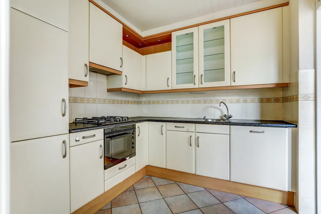 De halfopen keuken in een hoekopstelling heeft diverse inbouwapparatuur. Vanuit de keuken loop je door naar de in 2005 aangebouwde bijkeuken met lichtkoepel, een royale en ideale ruimte voor je wasmachine en droger, extra kasten, etc.