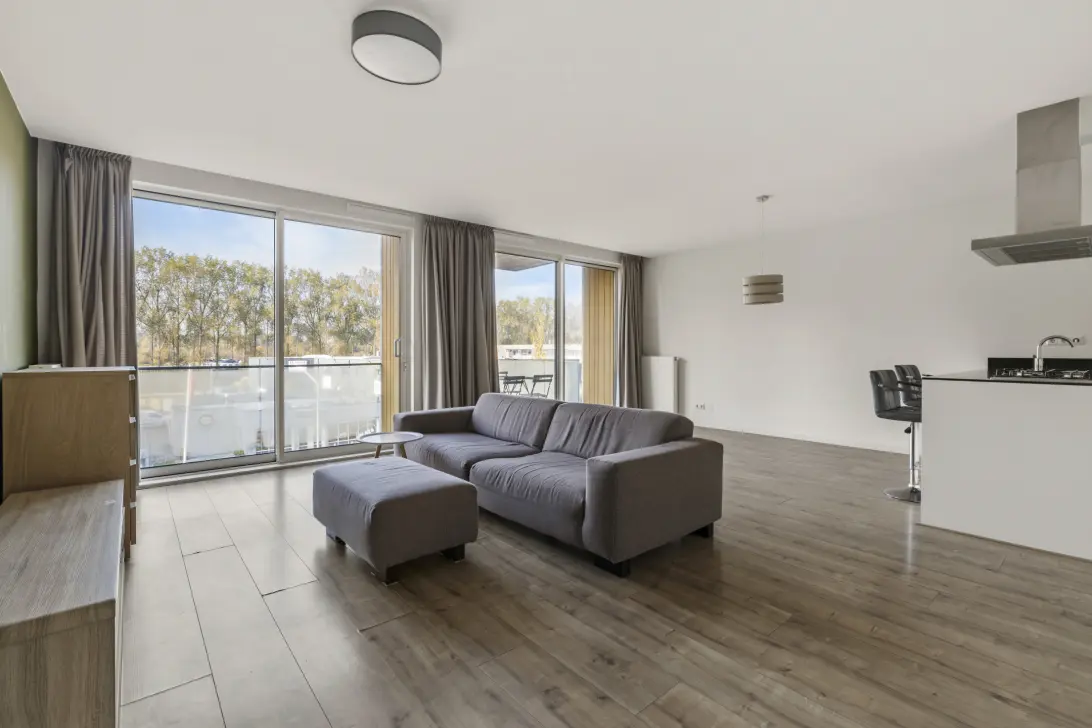 Vanuit de woonkamer zijn er door middel van twee schuifpuien de twee balkons op het westen te bereiken. Vanuit de woonkamer en vanaf de balkons heeft u een fraai uitzicht over het water, Aquamarin en veel groen.