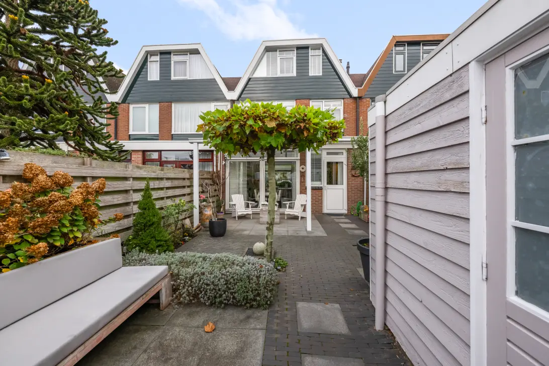 De tuin is achterom bereikbaar, handig voor fietsen, containers of tuinbenodigdheden. Aan de voorzijde ligt een nette voortuin die zorgt voor een verzorgde binnenkomst.