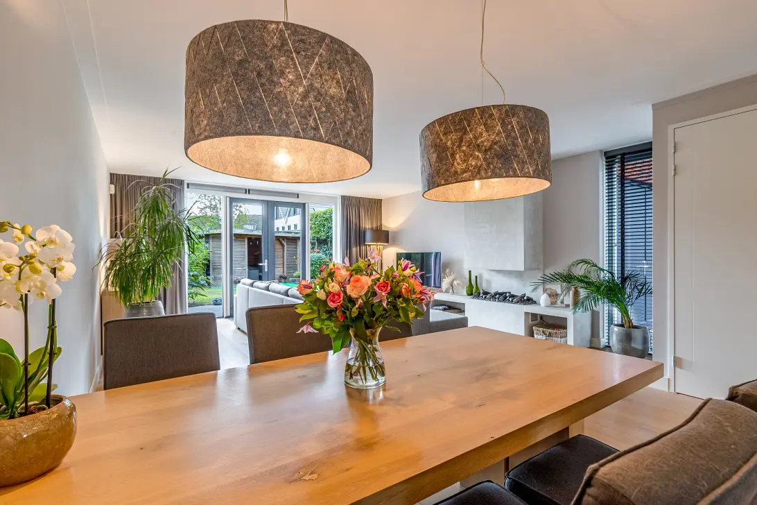 De royale woon/eetkamer is voorzien van een mooie sfeerhaard en een prachtige houten parketvloer.