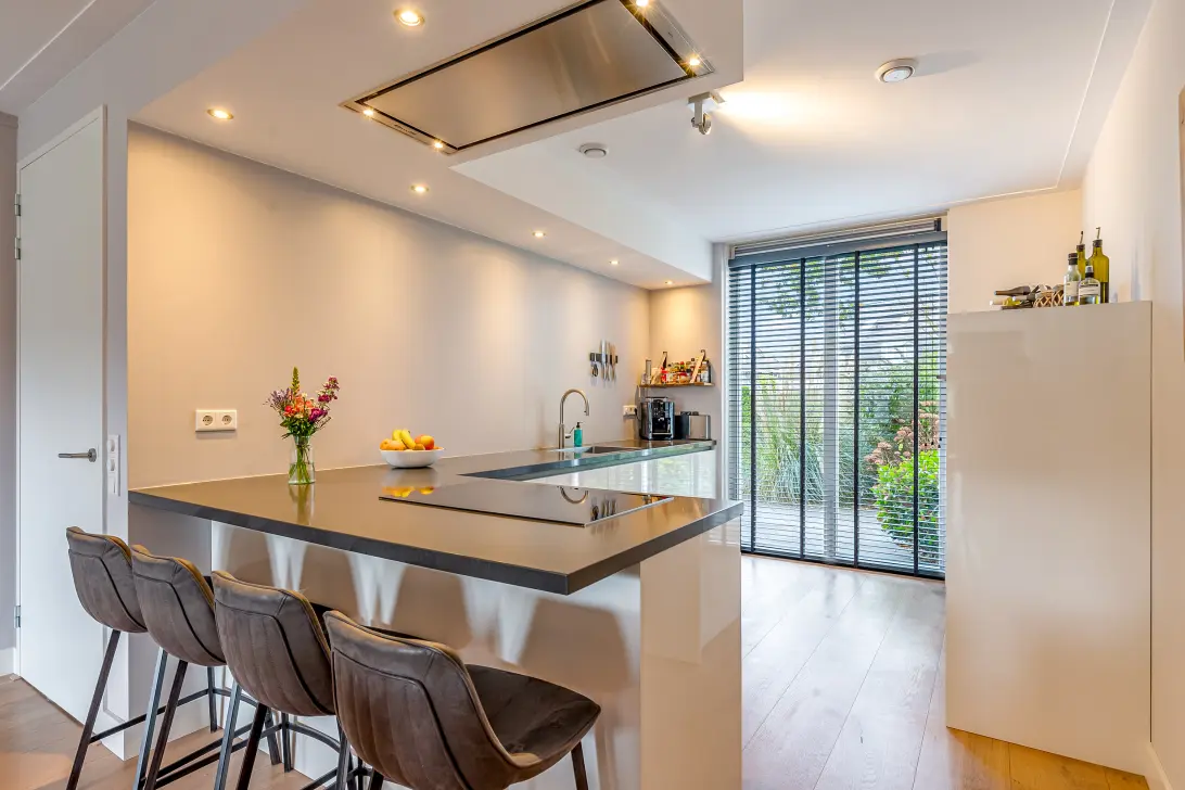 De open, lichte keuken is van alle gemakken voorzien, met een kookschiereiland, inductiekookplaat, vaatwasser, Quooker, oven, combi-oven/magnetron, koelkast en vriezer.
