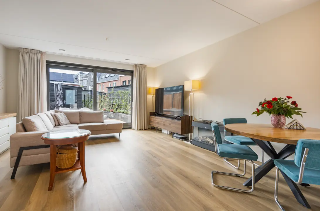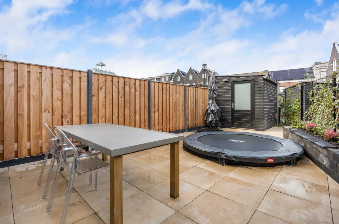 Entrance to the house. Hall with meter cupboard, modern toilet with wash basin, staircase to the first floor, and access to the living room. The living room is wonderfully bright thanks to the large windows and offers ample space for both dining and seating areas. There is also a storage cupboard under the stairs and a sliding door leading to the backyard. The garden is well maintained and includes a detached wooden shed with electricity, a built-in trampoline, and back entrance. It’s a great place to relax after work with family and friends over a sunny barbecue. On the enclosed courtyard there is a private parking space with charging station.