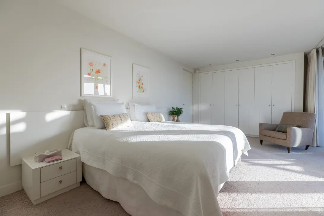 De master bedroom met airconditioning beschikt over twee kastenwanden en een schuifpui naar het tweede terras.