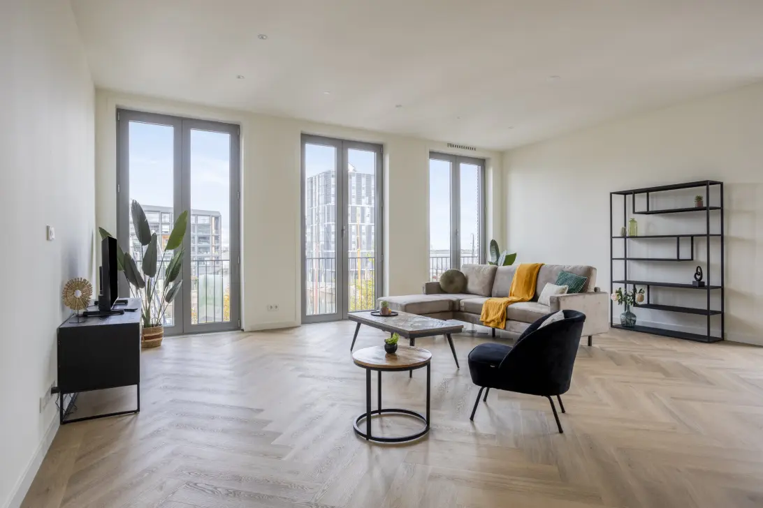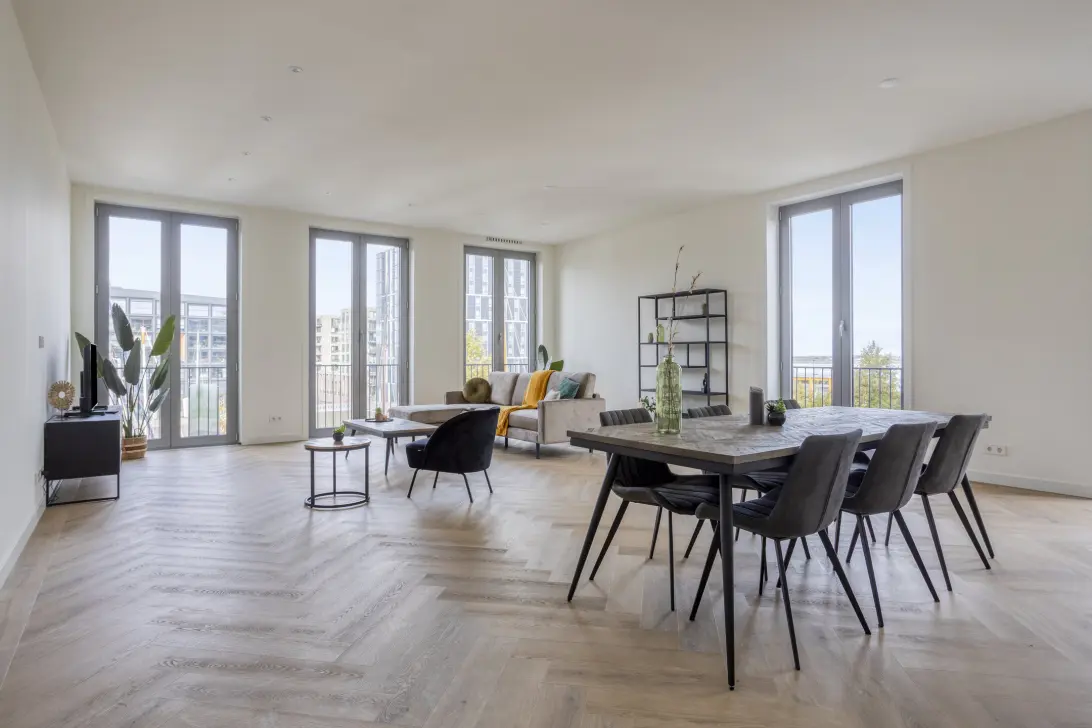 De royale woonkamer strekt zich uit over de volledige breedte van het appartement en wordt omringd door grote ramen en meerdere Franse balkons die zorgen voor een prachtig daglicht en een schitterend uitzicht over het water.