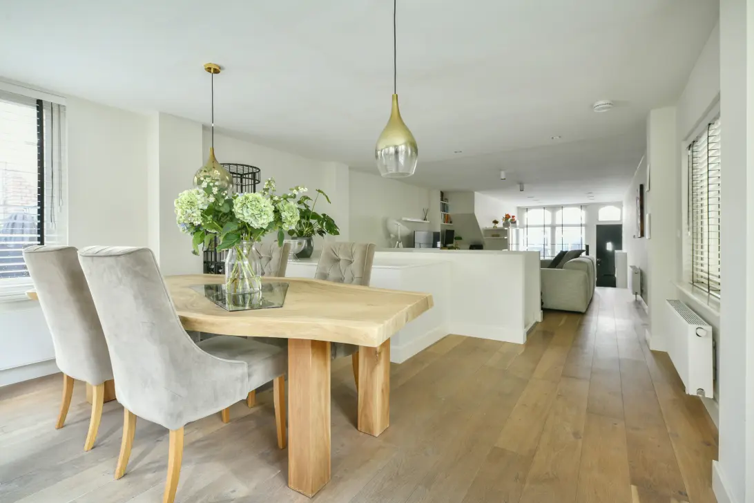 De woning is geheel afgewerkt met een fraaie eiken lamelparketvloer, wat zorgt voor een warme en natuurlijke uitstraling.