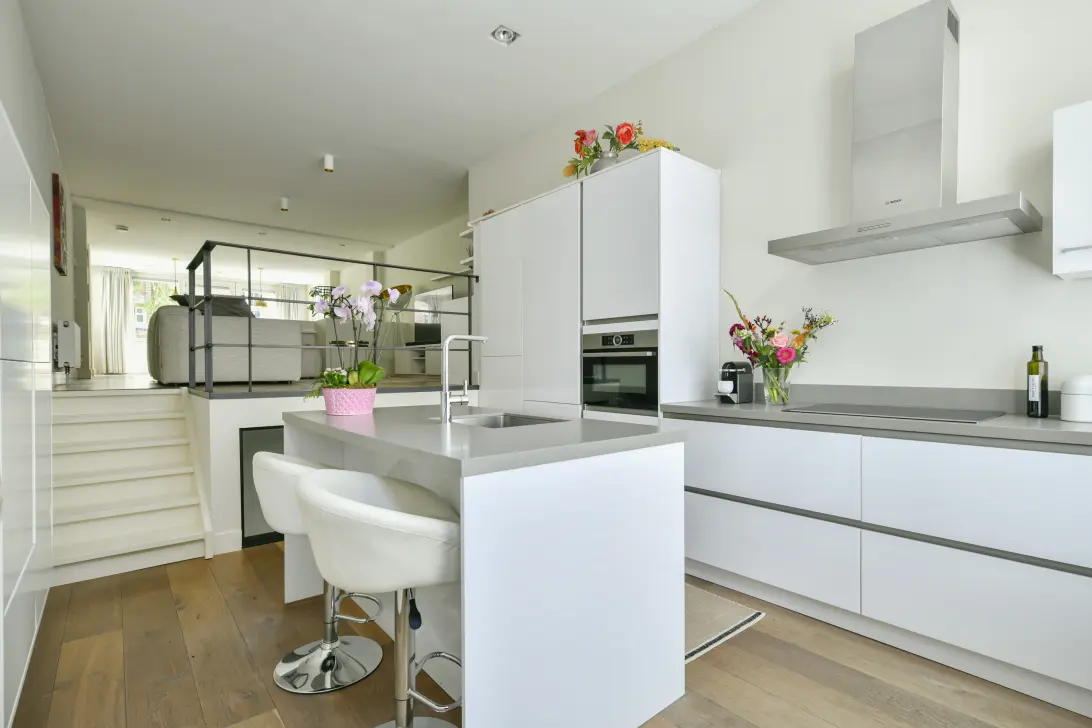 Via je eigen entree vanaf de straat stap je binnen in de lichte woonverdieping. De open keuken met hoge plafonds en spoeleiland vormt het hart van het huis. Uitgerust met alle moderne inbouwapparatuur is dit een plek waar koken en gezelligheid samenkomen. De keuken is voorzien van een inductiekookplaat, koelkast/vriezer, vaatwasser, combi-magnetron, afzuigkap en heeft meer dan voldoende kastruimte.