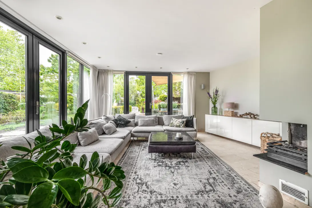 Ruime voortuin met een oprit en toegang tot de entree en de berging. De lichte en royale entree is voorzien van een garderobe, een separaat toilet en de trap naar de eerste verdieping. Vanuit de hal is er ook toegang tot de bijkeuken, berging en de werkkamer, die beide directe toegang bieden tot de achtertuin. Aan de voorzijde van de woning bevindt zich de halfopen keuken (Siematic) in T-opstelling. De keuken is uitgerust met diverse inbouwapparatuur, waaronder een combi-oven, een 4-pits gaskookplaat met afzuigkap, een koelkast en een vaatwasser. Via de keuken is de eetkamer te bereiken, die zich eveneens aan de voorzijde van de woning bevindt. De sfeervolle woonkamer met open haard is gelegen aan de achterzijde van de woning en biedt een prachtig uitzicht op de fraai aangelegde tuin. De tuin is bereikbaar via een van de twee openslaande deuren in de woonkamer.