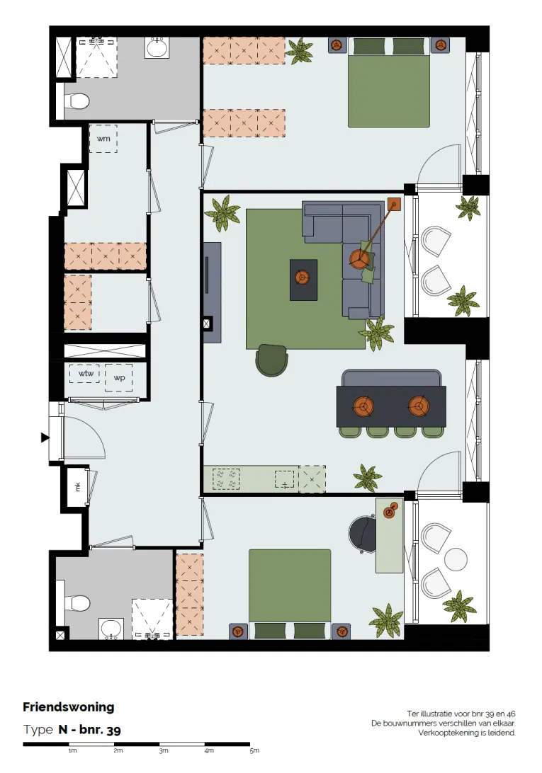 Hier hoeft u niet in te leveren op privacy en comfort. Met twee volwaardige slaapkamers, elk met een eigen badkamer, biedt deze woning de ideale indeling voor bijvoorbeeld ouders met een volwassen kind of een stel met een inwonende ouder of ander familielid.