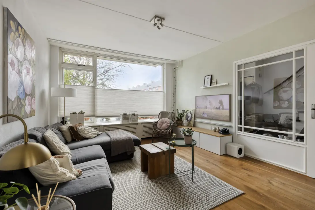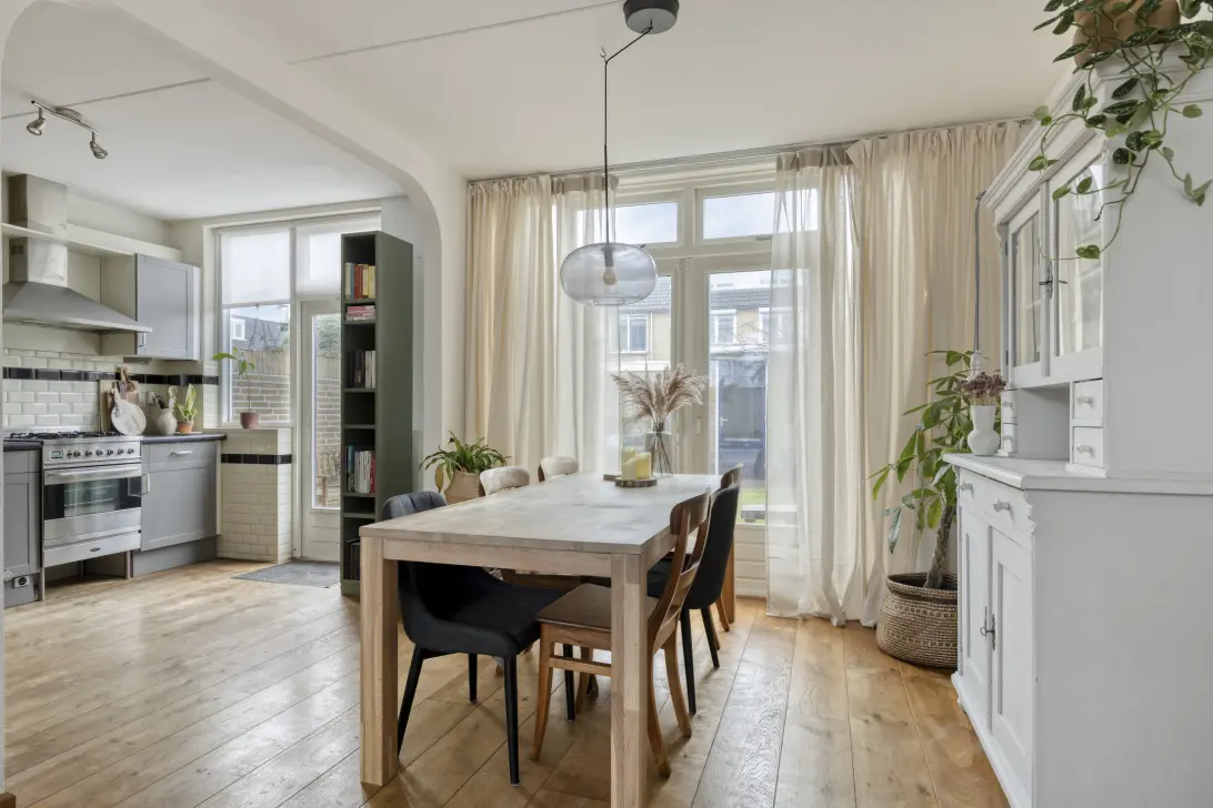 De sfeervolle woonkamer is aan de straatzijde gelegen en geniet van prettig daglicht dankzij doorzon situatie. De ruimte staat in open verbinding met de eetkamer, wat zorgt voor een aangename en ruimtelijke sfeer.