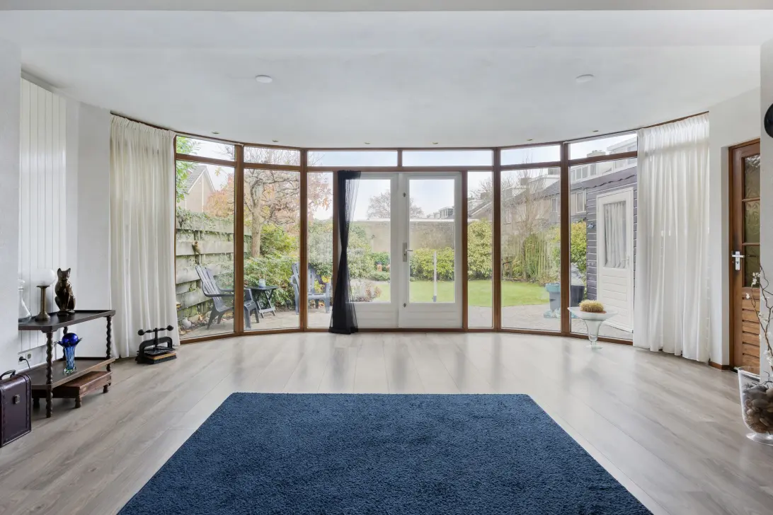 De straatgerichte woonkamer is heerlijk licht door het doorzon model. Aan de voorzijde is een gigantisch raam. Door het ruim opgezette kavel ervaar je hier toch de privacy die je mag verwachten.