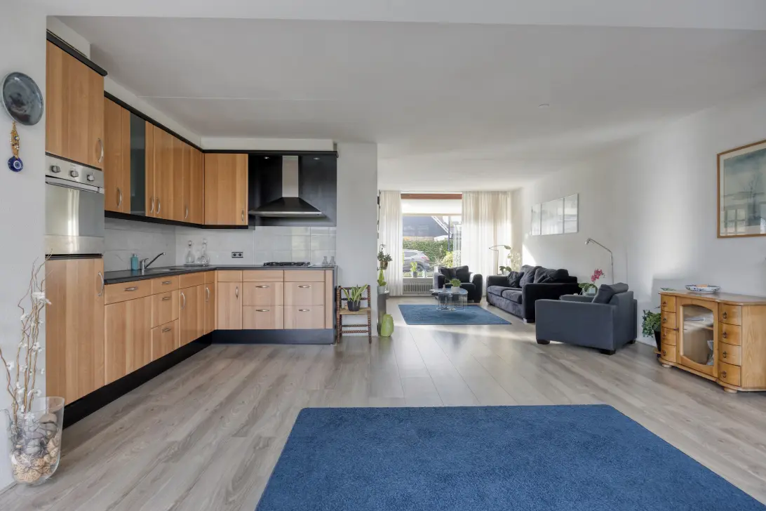 De open keuken bevindt zich aan de achterzijde. De woning is achter uitgebouwd, met een unieke, halfronde uitbouw. Hierdoor komt er veel natuurlijk licht de kamer in. Er is ruimte voor een grote eettafel, zodat je heerlijk met vrienden en familie uitgebreid kunt tafelen.