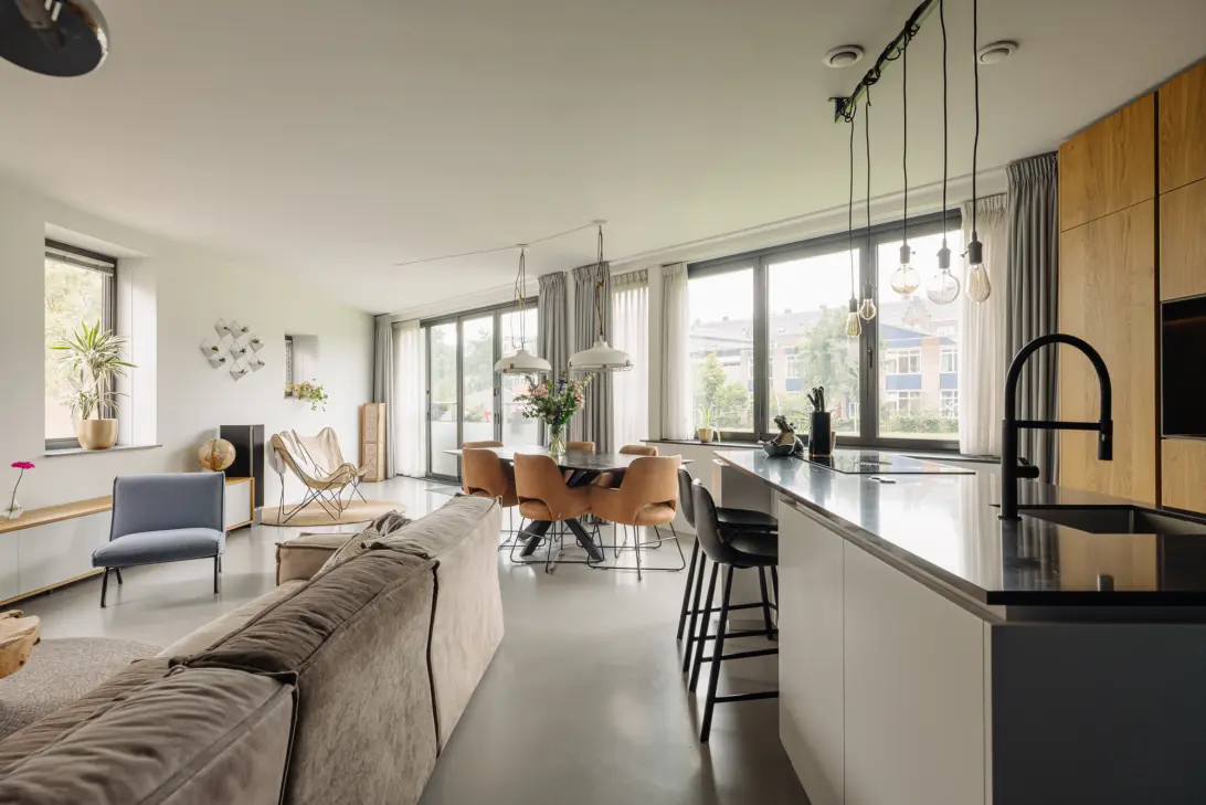 Via de unieke stalen deur, speciaal ontworpen voor dit appartement kom je uit in de royale woonkamer en woonkeuken. Dankzij grote raampartijen aan twee zijden en openslaande deuren naar buiten is dit een lichte, open ruimte met royaal zicht op het park. Door de harmonicaramen open te schuiven, is er een mooie, open connectie met buiten.