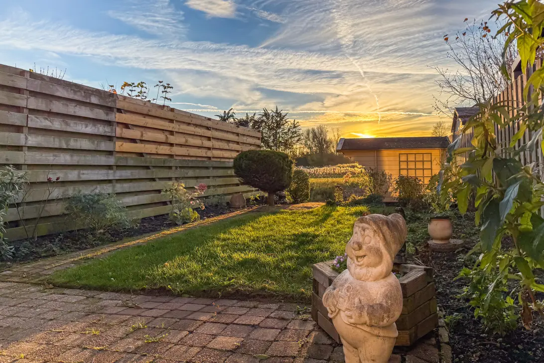 De achtertuin is gunstig gelegen op het zonnige zuidwesten en biedt u volop zon gedurende de dag. Het terras direct aan de woonkamer beschikt over een zonnescherm, op zonnige dagen zorgt deze voor extra comfort.