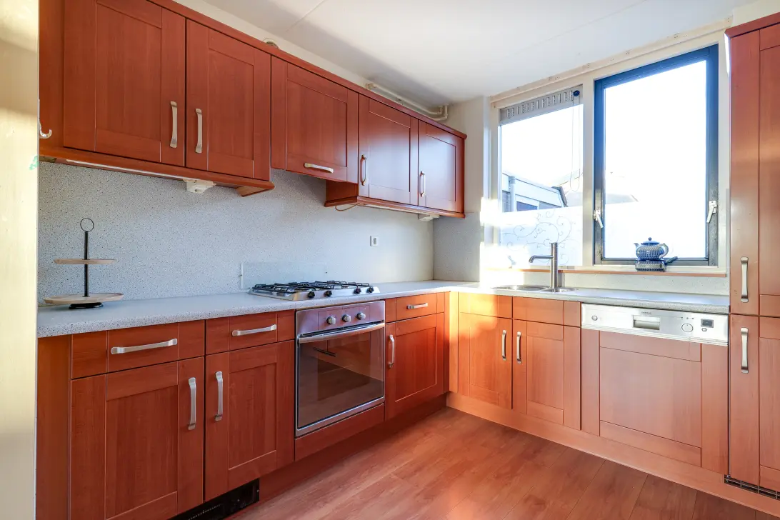 De half open keuken is aan de voorzijde van de woning gelegen en voorzien van diverse inbouwapparatuur zoals een 4-pits gaskookplaat, wasemkap, koel-/vriescombinatie, oven en vaatwasser. De keuken sluit mooi aan op de eethoek en vormt zo een geheel met de woonkamer.