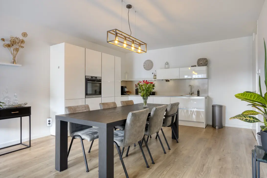 De luxueuze keuken is in een praktische L-opstelling. De keuken is uitgevoerd met strakke, lichte fronten en aanrechtblad wat samen zorgt voor een moderne uitstraling. In de keuken beschik je over voldoende kast- en werkruimte en daarnaast is deze voorzien van de nodige inbouwapparatuur. Wij noemen: een inductiekookplaat met kookveldafzuiging, oven, vaatwasser, koelkast en vriezer.