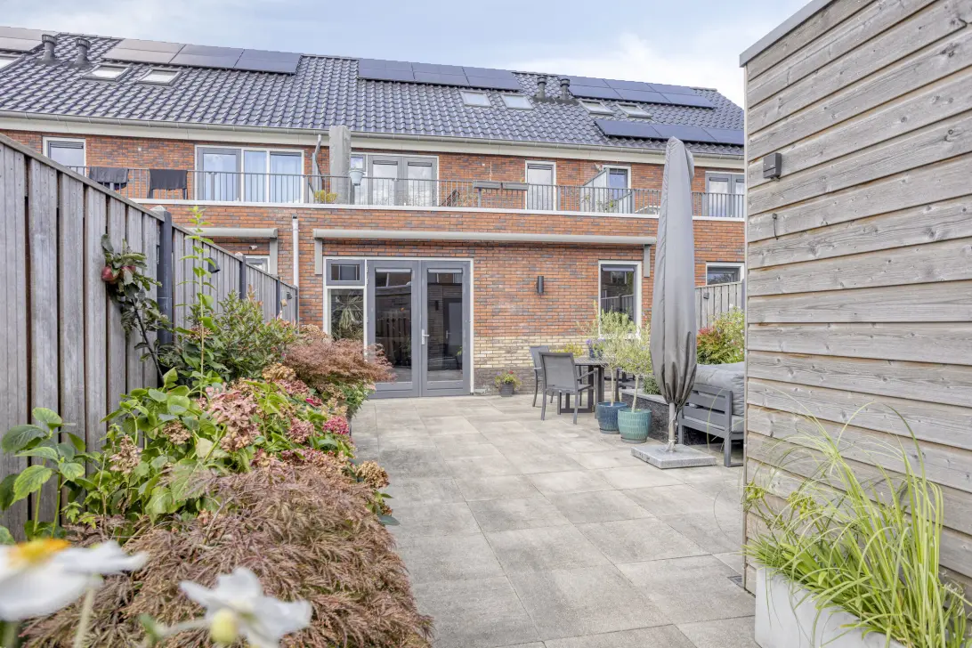 Zowel vanuit de woonkamer als via een achterom is de zonnige achtertuin toegankelijk. Deze is gelegen op het zuidoosten en vrijwel onderhoudsvriendelijk aangelegd, waardoor je meer tijd overhoudt om te genieten van het buitenleven. Verder is de tuin ingericht met bestrating, vaste beplanting en een handige, houten vrijstaande berging met elektra waarin je alle gebruikelijke spullen netjes op kunt bergen. De poort geeft toegang tot het achtergelegen steegje. Aan de achtergevel hangt een zonnescherm over de volle breedte van het appartement. Aan de voorzijde is een voortuin.