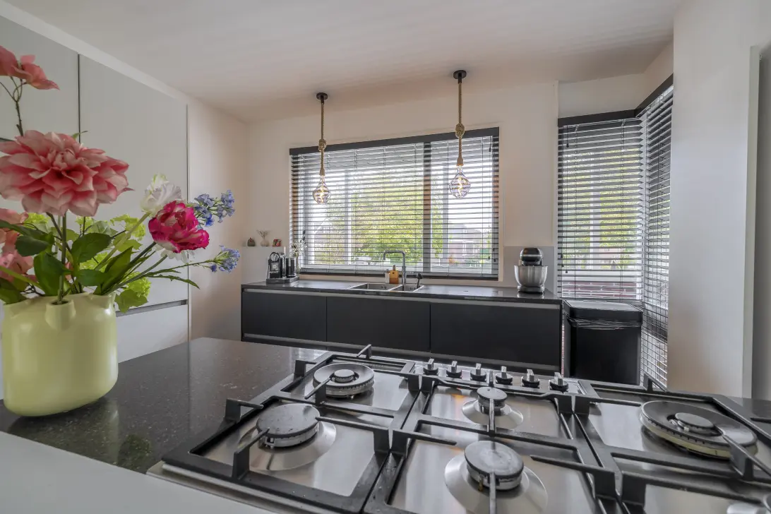 In de speels ingedeelde woonkamer is genoeg plek voor een grote zithoek, een tv-meubel en de eettafel. Fraaie elementen zijn de grote ramen, het schuine dak, de trendy zwarte deur naar de hal en de directe toegang tot het balkon. In de zeer ruime keuken wordt zelfs de meest verwende kookliefhebber verwend. De keuken bestaat uit drie delen: het spoelgedeelte bij het raam, een hoge kastenwand en een kookeiland. Alle benodigde apparatuur is ingebouwd: een 6-pits gaskookplaat, plafondafzuiging, vaatwasser, Quooker, combi-oven, koelkast en een vriezer.