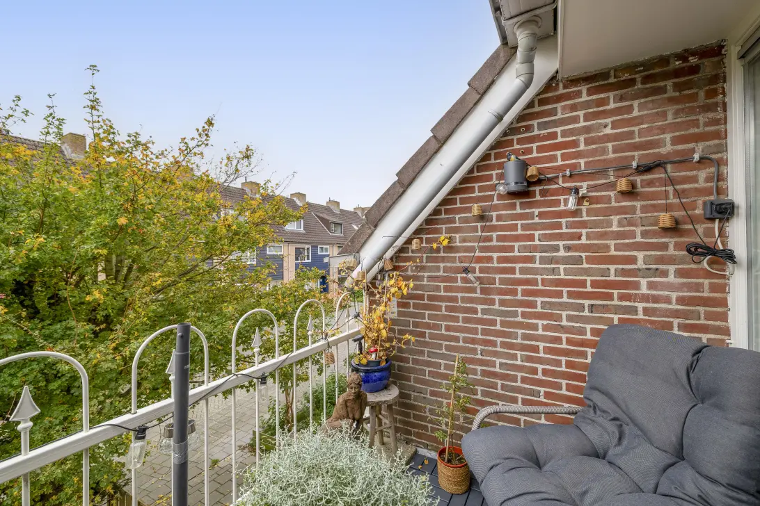 Het balkon, te bereiken vanuit de woonkamer, is een fijne plek om buiten te zitten. De ligging op het zuidwesten is perfect voor de zonliefhebber en het uitzicht is fraai, naar de rustige straat met veel groen in de tuinen.